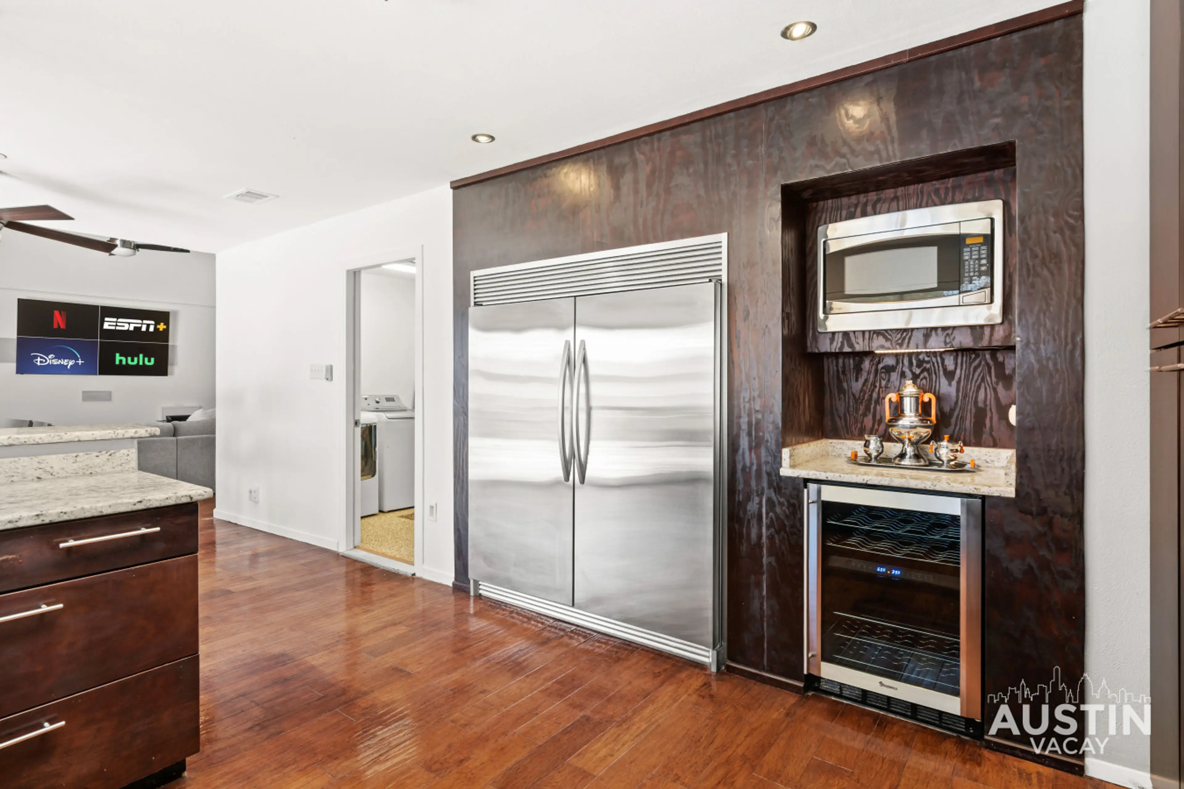 Spacious and design-forward near The Domain, this four-bedroom, two-bath retreat blends vaulted ceilings, clean lines, and effortless indoor-outdoor living. A private pool and hot tub anchor the fenced backyard, complete with a covered pergola lounge, outdoor TV, and full grilling station. Inside, a...